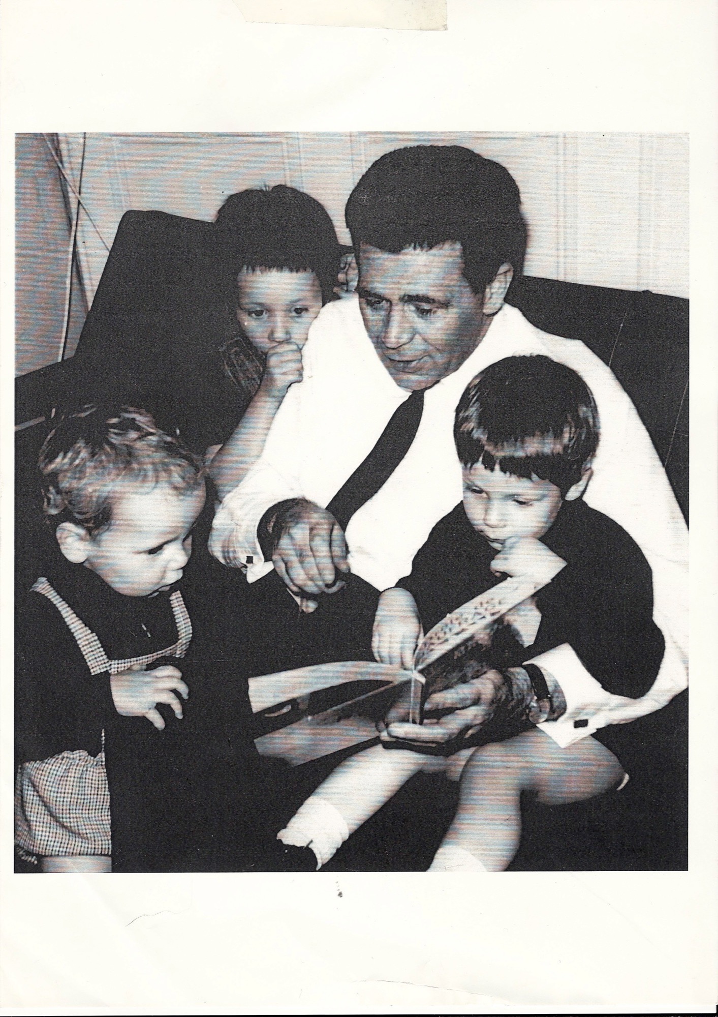 Mais la famille s’est agrandie et nous fûmes bientôt trois à jouer des coudes et à grimper sur le bord du fauteuil pour mieux écouter et regarder les images. C’était très important d’être placée de manière à voir toute l’illustration de la page (en apercevoir un fragment ne correspondait pas du tout à l’idée que je me faisais du statut d’aînée de la fratrie). Or, il y en avait toujours un, plus petit que moi, plus confortablement installé sur les genoux ou dans le creux du bras, dont la crasse tignasse hirsute masquait le livre tant convoité. Dépitée, je me vengeais en collant mon visage au plus près de l’épaule paternelle. Là, mon oreille captait toutes les nuances de la belle voix de baryton qui ronronnait au rythme des pages tournées. J’avais ce grand privilège d’entendre l’histoire à la naissance du son, des mots, des phrases.
